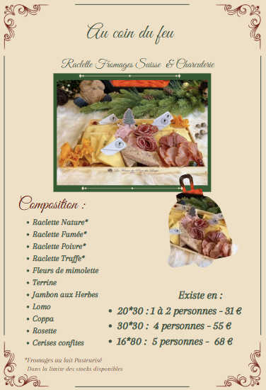 Toute l’équipe de La Ferme du Pont des Loups est heureuse de vous présenter ses plateaux soigneusement conçus pour vous à l’occasion de cette période festive.